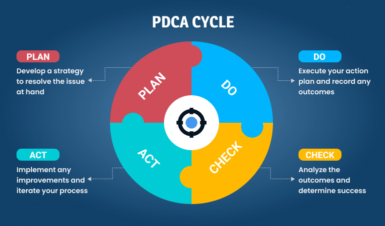 دورة PDCA (خطط – نفذ – افحص – اعمل): هي إطار عمل يستخدم لإدارة وتحسين العمليات والنظم بشكل مستمر، وتساعد هذه الدورة على تحسين الأداء من خلال تطبيق خطوات متكررة ومنهجية، وتقوم هذه الدورة على: